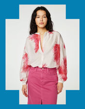 The product: Blouse edit: Upgraded. For spring and summer, opt for this blouse featuring pink leaves over a neutral backdrop. The silhouette is built with airy, blouson sleeves and a mock neck, with buttons through the front to fasten. Looks best with denim.