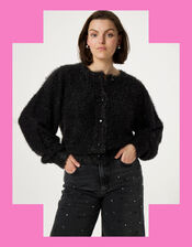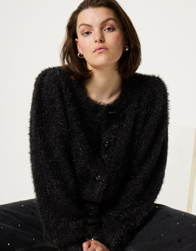 The product: A little bit of winter sparkle never hurt anyone! Threaded with glistening metallics and a super-fun fluffy finish, this cardigan boasts a round neckline, blouson sleeves, and a button-through fastening at the front.
