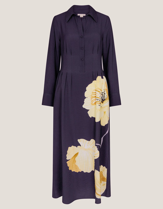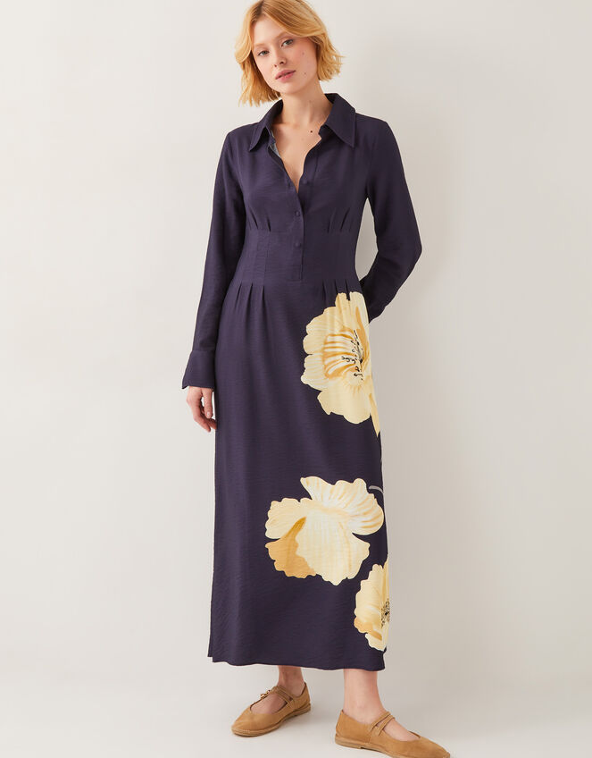 Style in full bloom. Inviting a touch of artistry and feminine charm to your wardrobe, this midi dress is designed with a shirt-inspired top, fitted waist and midi length hem that's decorated with bold florals in a buttery yellow hue. Blue