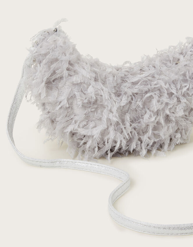 It's dress up time! Inspired by a feather boa (but in bag form), this sling bag is a fun addition to their collection of accessories. Designed with feathery yarns, a glittery silver strap and top zip fastening.