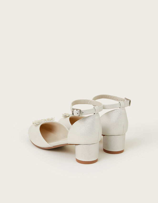 Just add party dress. These shimmery shoes are designed with a closed toe, short block heel and a flower-adorned butterfly brooch at the toes. Fastens with a buckle at the ankles for all day comfort whilst dancing. Silver