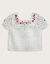 Pretend it's vintage. A retro style for the new generation, this blouse is designed with monochrome checks and symmetrical floral embroidery framing the frilly square neckline and puff sleeves. Ivory