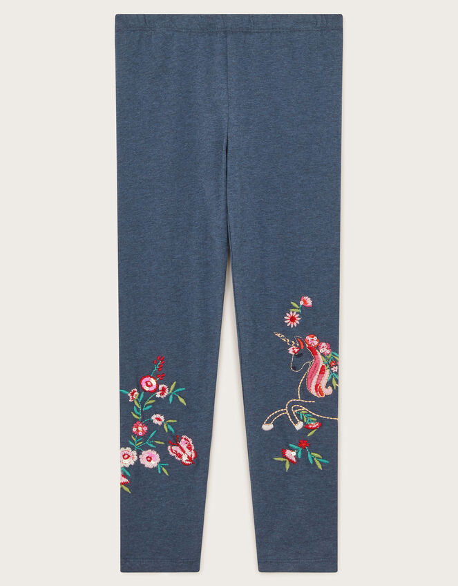 Every day magic! Designed in blue jersey for an almost-denim look, these leggings are decorated with embroidered florals and a unicorn design trailing up the cuffs. Complete with a stretch waistband for all-day comfort. Blue