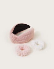 Super soft, extra stylish, and oh-so sweet. A trio of hair accessories that add playful touches to their looks. This set includes a pink fluffy headband with a knotted design, and two faux fur hair scrunchies in pink and white with pearly bead embellishments.