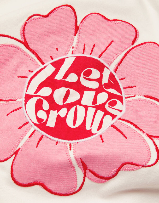 In full bloom. This set includes a white cotton tee with frilly sleeves and a floral graphic on the front that reads 'Let Love Grow', along with a pair of pink leggings decorated with smiling flowers embroidered at the cuffs. A comfy and cute outfit they can wear any day of the week. Pink