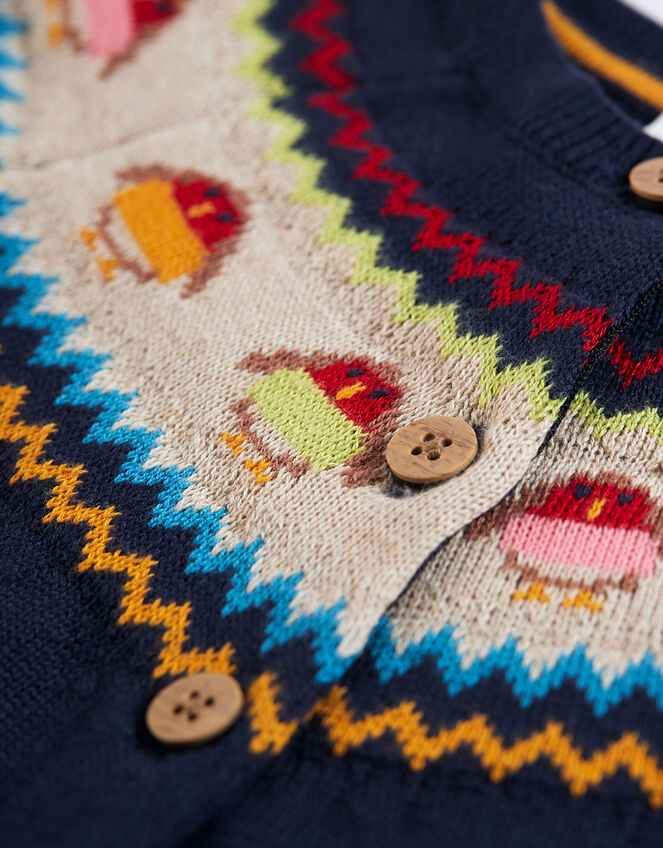 An aptly wintery overlay for every day of the week, this cardigan is built with a soft knit. Amongst the fair isle design sits a group of sweet robins, with embroidered stars for a pop of colour. The half button through fastening allows them to show off their outfit, with ribbed detailing to the neckline and cuffs for a secure fit.