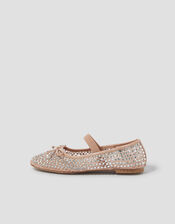 Pump it up. Not your average ballet flats, this sparkly pair is designed in a chic meshy fabric decorated with dazzling diamantes. Finished with an elastic top strap for all-day comfort. Pink