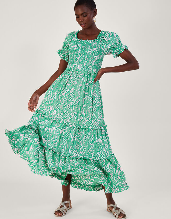 A hint of mint can be seen in the soft green hue of this dress, doused in a geometric print throughout the maxi length. It features soft ruffles through the trims with a shirred bodice and tiering towards the hem.