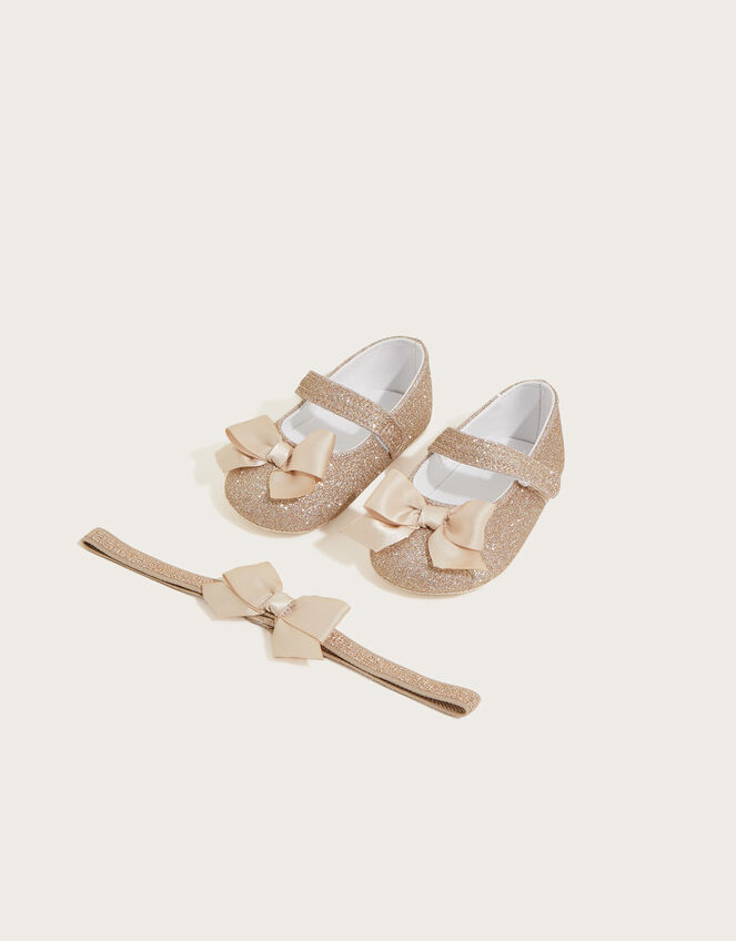 They’ll look like real cuties in these booties. This set features super-glittery gold-tone shoes that fasten with a rip-tape strap, and a matching elasticated bandana adorned with delightful bow motifs. Gold