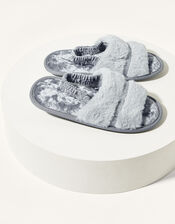Finished with a touch of glitter: this glamorous pair has a cushioned sole that'll leave you feeling like you're walking on clouds. Their faux fur straps and stretchy back strap works to keep the foot secure. Grey