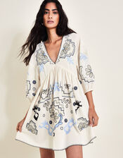 It's kaftan season (finally). Embroidered with abstract and botanical designs, this kaftan is short, flippy and cut to catch the sea breeze. Featuring cropped blouson sleeves and a v-neck, it pairs best with a floppy hat and flat sandals. Ivory