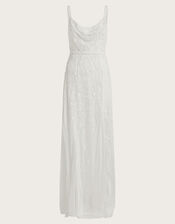 Romantic. Sitting defined at the waist, you'll find subtle 90s inspiration through the cowl neckline and slim straps of this dress, whilst the A-line skirt brings a traditional finish to the silhouette. Turn it to its back to find a straight cut, concealed zip and a light train to complete the profile.