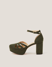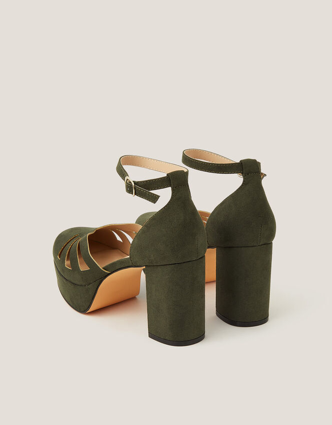 Big Dancing Queen energy. A statement pair ready to elevate (literally) all your party looks, these platforms feature a closed toe with cutwork details and a chunky block heel. Finished with a buckle strap fastening around the ankle. Green