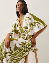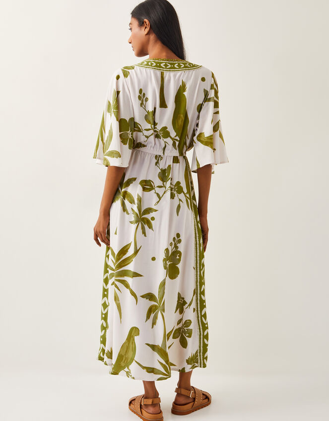 Chase the sun in this. A versatile style you can wear over swimwear or dress up for the evening, this dress is primed for the sunshine. Designed with floaty sleeves, a V-neckline and ankle-skimming hem, it's decorated with a tropical mix of hibiscus flowers, palm trees and parrots in rich, olive tones. Green