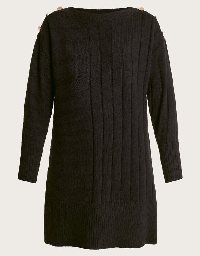 A mini dress: Winter edition. Designed in a soft knit blend, this jumper dress hems above the knee with long sleeves and a round neck. Finished with a ribbed effect and buttons over the shoulders. Black