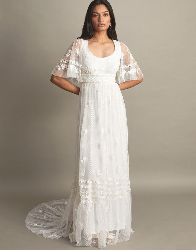 Beach bride bohemia. Built with a scoop neckline, angel sleeves and a beautifully floaty skirt, this bridal dress exudes bohemia. Overlaid with tulle, find a spotted pattern throughout with accents of embroidered florals, lace, and cutwork for textural elevation. Turn it to its back to find a v-shaped dip and concealed zip fastening.