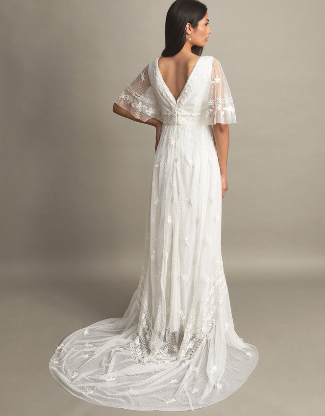 Beach bride bohemia. Built with a scoop neckline, angel sleeves and a beautifully floaty skirt, this bridal dress exudes bohemia. Overlaid with tulle, find a spotted pattern throughout with accents of embroidered florals, lace, and cutwork for textural elevation. Turn it to its back to find a v-shaped dip and concealed zip fastening.