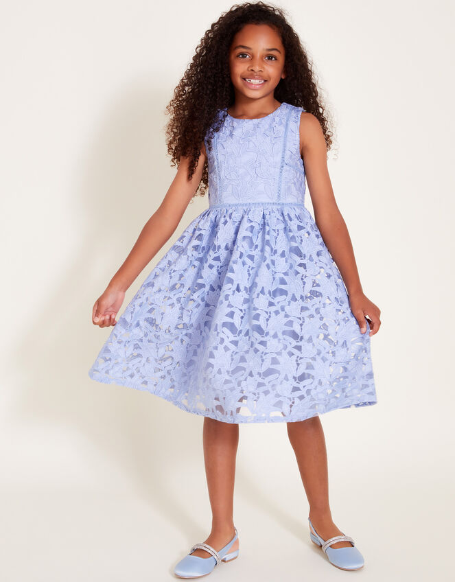 Feeling Blue-tiful. Created in cutwork floral lace soaked in a baby blue hue, this dress matches the bright morning sky! For a sweet occasion-ready look, pair with their favourite dancing shoes. Blue