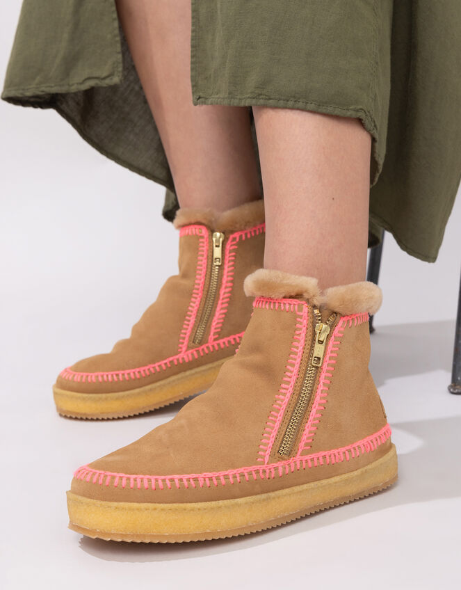 The product: Cosy steppin'. These ankle boots are the trans-seasonal piece. Lightweight and pillowy soft, these boots feature a sheepskin lining, insole, and contrast stitching through the upper.