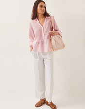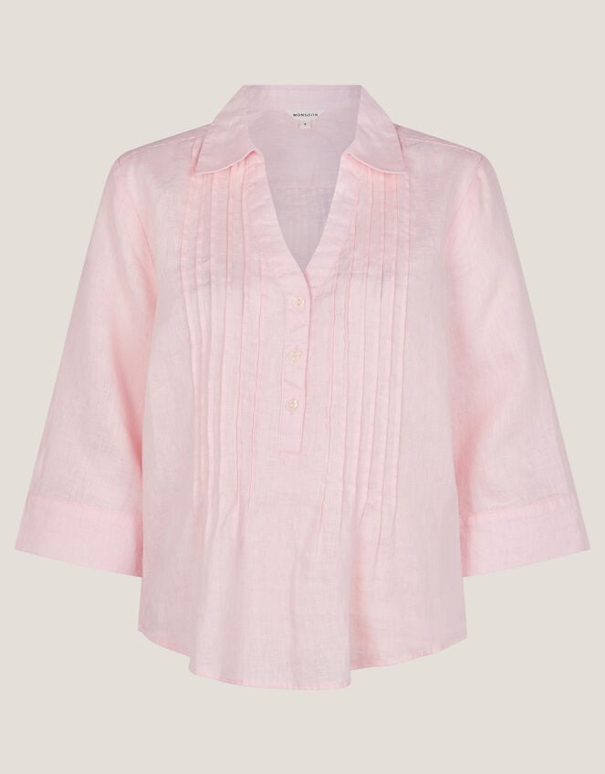 Effortless (the way we like it). A style fit for any spring or summer outing, this shirt features a loose fit with a pleated placket. Cut with a v-neckline and button details. Pink