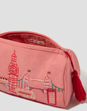 Get the London look. Showcasing a cityscape print of the big smoke, this cosmetics bag is a great gift for anyone who's a makeup-on-the-train kinda gal. Fastens with a zip and red tassel cord.