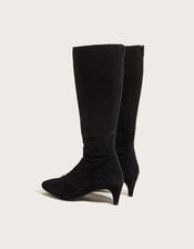 Effortlessly slouchy, these evening boots combine a short stiletto heel with a longline profile. Designed in luxurious suede, slip them on over skinny jeans or leather look leggings for a chic look. Fasten at the back with zips. Black