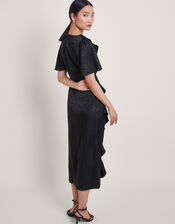 Eclipsing. Doused in soft satin that glides on your skin, this dress boasts a cross-over bodice, falling into a midi skirt with dancing ruffles cascading throughout. Finished with a blink-and-you'll-miss-it leopard print finish for a touch of mystery. Black