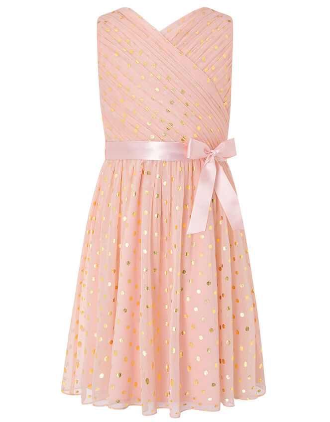 She’ll look beautiful in Mabel. The wrap-style gown is coated in gold spots and has a pleated bodice, a ribbon waist tie and a concealed side zip fastening. It’s fully lined to keep her comfortable and machine washable for easy care.