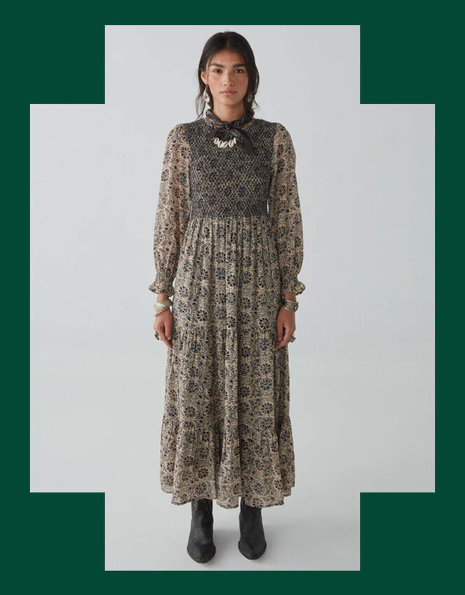 The product: Hello, boho. Made for comfort, this dress features a shirred bodice before falling into a tiered maxi skirt. Finished with cuffed sleeves that create a pretty ruffle and an all-over floral print.
