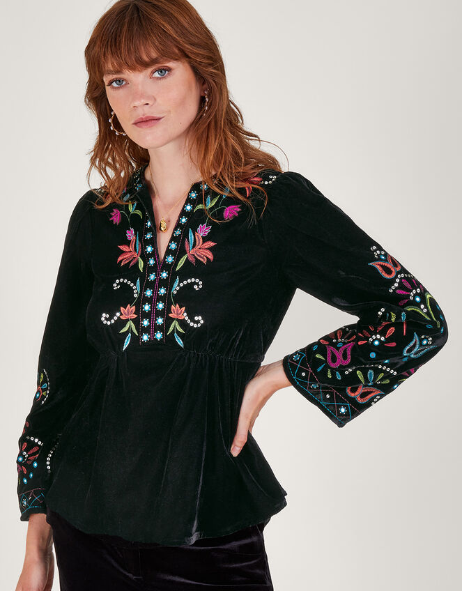 Ooo velvet. Alongside the most vibrant embroidery and playful mirror details, take this velvet blouse into the office and await the compliments (it won't take long). Undeniably 70s inspired, we’ve drawn flared details into the hem and sleeves. Black