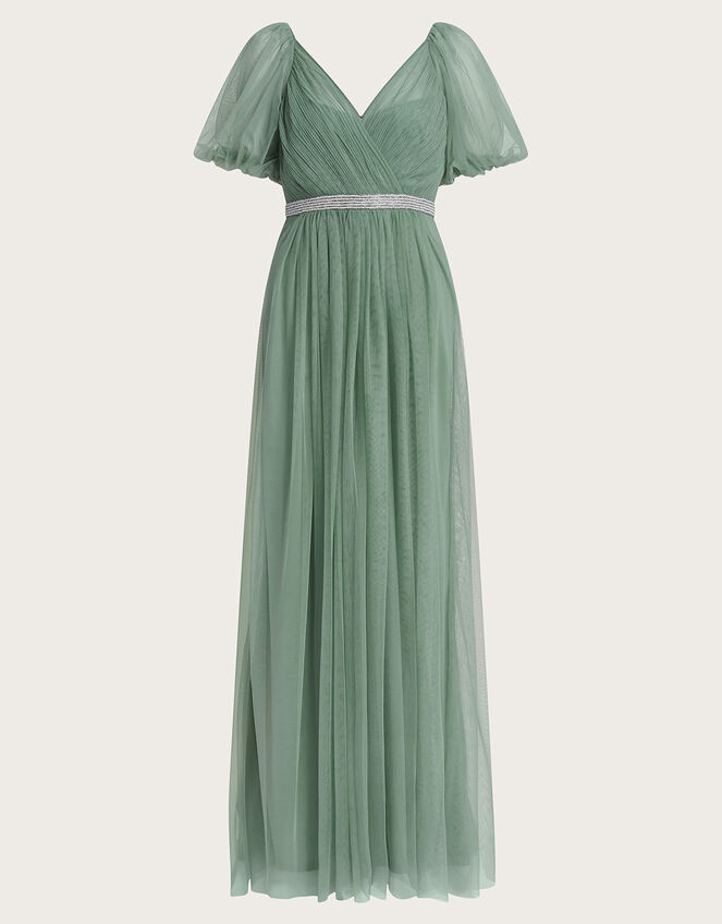 Unbeatably angelic, Meghan was made for the most special of events. She features a ruched bodice in a wrap finish, with embellishments to enhance the waist and puff sleeves for an airy fit. Prepare to mesmerise anyone who sets eyes on the floaty skirt, falling delicately in pleated mesh to maxi length. Green