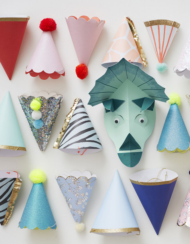 Putting a glittery spin on the traditional design, these party hats are ideal to gift your little one's friends on arrival to the party. Crafted in a long tapered profile, they're doused in glitter and finished with scallop trims. Finished with an elasticated band for comfort and topped with a neon pom-pom.