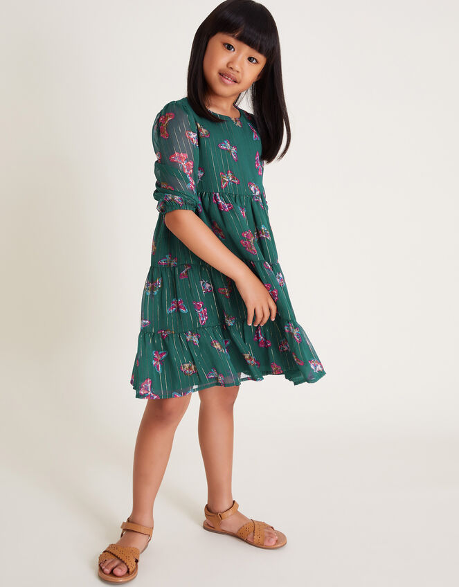 Cue: party time. Whisked from shimmery chiffon, this tiered dress is framed with sheer ¾ length sleeves and adorned with golden threads and fluttering butterflies. All you need now is the dancing shoes! Green