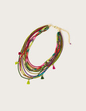 From lime green to raspberry, this necklace is vibrant to say the least. Made to brighten up blouses and dresses, it boasts a layered profile with beads, tassels and woven rows to really catch your attention.
