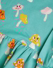 Foragers, unite! Designed in a sweet, skater profile, this dress is printed with adorable smiley mushrooms through the long sleeve bodice and flared skirt. Finished with stripe ribbed trims to the neckline and cuffs. Blue