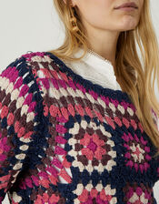 Warmer than a top, lighter than a knit: this navy hand crocheted jumper is bursting with colour thanks to its pink, peach and ivory accents. Throw it over your tee before the evening breeze seeps in and let the breathable crochet work to keep you the perfect temperature. Black