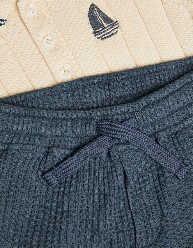 So smart, so sweet. Comprising a super-soft ribbed knit polo T-shirt and stretchy waffle shorts, this oh-so-cute set is ideal for their first season of parties. Cream