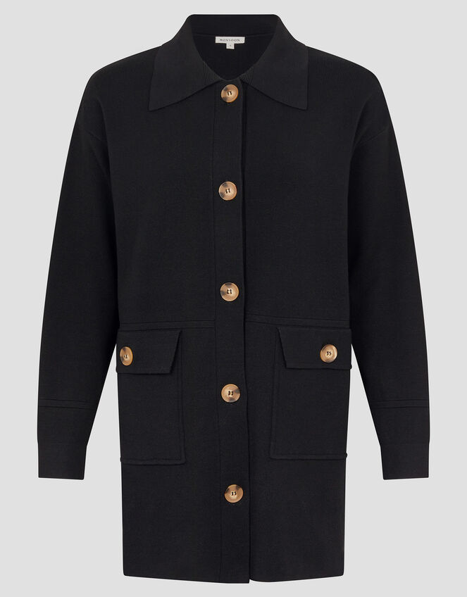 Wardrobe staple: found. Merging the cosiness of knitwear with the timeless utility trend, this knitted jacket is designed with a classic collar, front button fastenings and two cargo-inspired pockets. Black