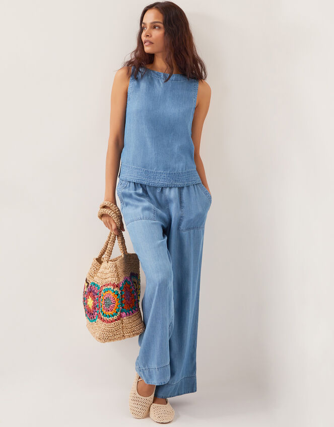 Jean-ius. Designed in a soft tencel fabric that offers a denim look, this tank top is the perfect pick for blue-sky styling. Finished with side button details. Create a cool, co-ordinated look with the Nyla Wide Leg Trousers. Blue