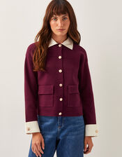 Smart move. With a shirt illusion thanks to the contrast collar and cuffs, this knit cardigan brings a polished finish to your look. Fastens through the front with decorative gold buttons. Red