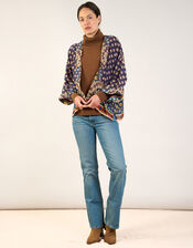 The product:Slip on, slip off. Master a luxurious finish with this piece styled as a top layer for special occasions. The silhouette hems at the hips and falls into a relaxed fit with long sleeves and an open front.
