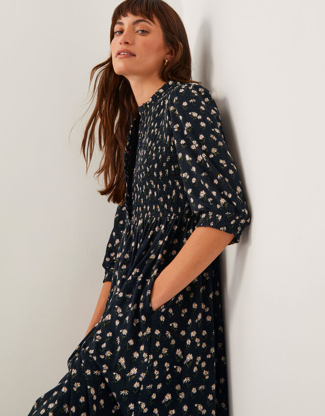 Pick of the season. Blossoming with little white flowers all over, this dress is designed in forever-faithful jersey with a shirred bodice, ruffle neckline and midi-length skirt. Did somebody say comfort? Black