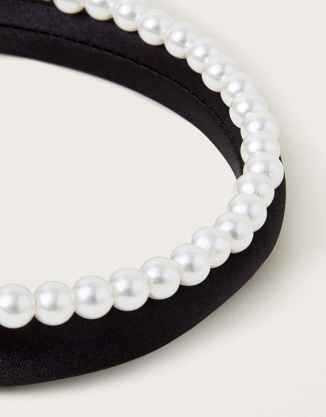 Breakfast at Tiffany's. Giving their best Audrey Hepburn, this double-layered headband boasts soft, black satin and faux pearls.