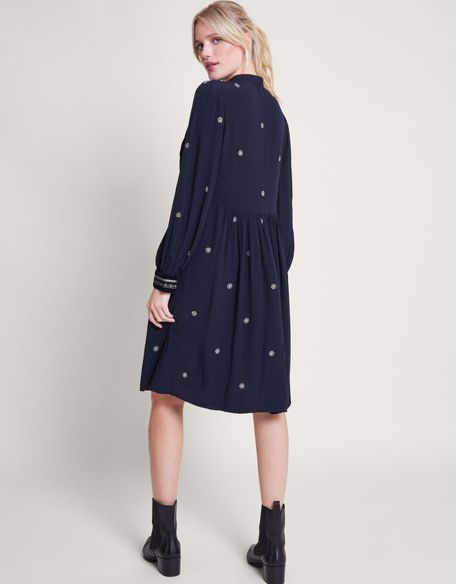 Medieval, but make it fashion. Designed with intricate floral embroidery, this dress combines gold with midnight blue. Cinched at the waist and falling into a relaxed knee length, expect endless compliments in this dress. Blue