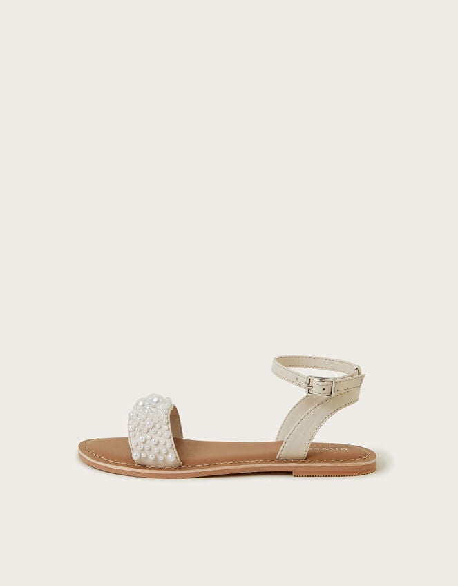 Pearly whirlies. A cute addition to their summertime shoedrobe, these sandals are designed with a flat sole, open toe and white straps decorated with shiny pearl beads. Fastens with a buckle around the ankles. Ivory