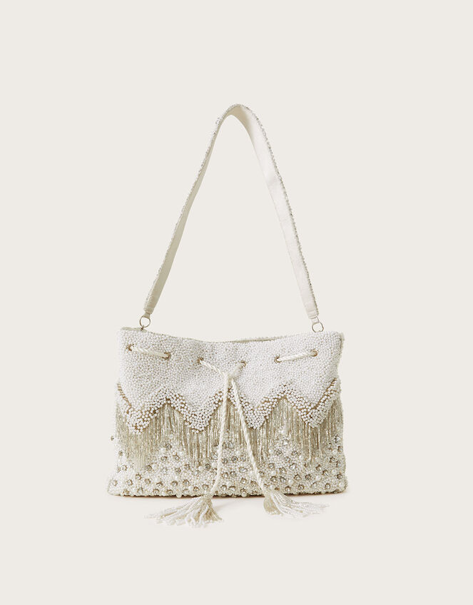 Drowning in embellishment, this pouch bag exudes 1920s glamour that was made for partying. To the front are mini pearls and diamantes, with silver tassels that'll swing as you take to the dancefloor. It fastens with a magnetic popper and drawstring detailing, keeping all your party essentials safe and secure.