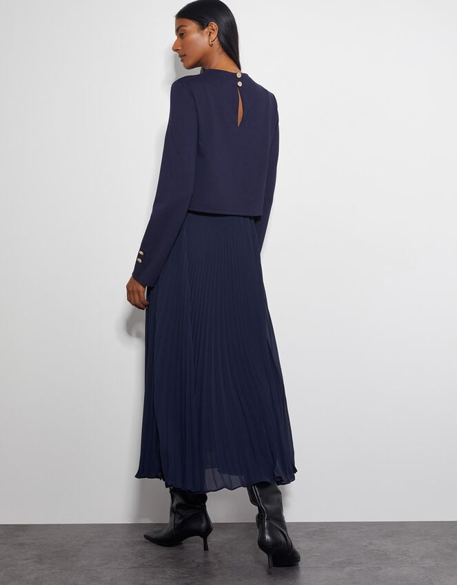 Maximum style, minimal effort. A smart, chic outfit built into an all-in-one style, this dress is designed with a long sleeve bodice, with a hem that's layered over the perfectly pleated midi-length skirt. All you need now is a pair of statement boots. . Blue
