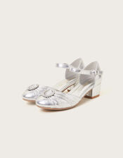 Click...clack... To pair beautifully with party dresses, these heels were made for special occasions. They're designed in silver faux leather with a pleated design and sparkly embellishment over the toe. Finished with a short block heel they'll love to spin around in. Silver