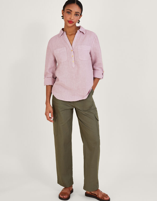 A piece you can throw on with anything, this laidback shirt is designed in airy linen. With a collared Y-neckline, it features button detailing and pockets over the chest, whilst the sleeves are finished with roll-up cuff buttons for a 3/4 length option. Purple