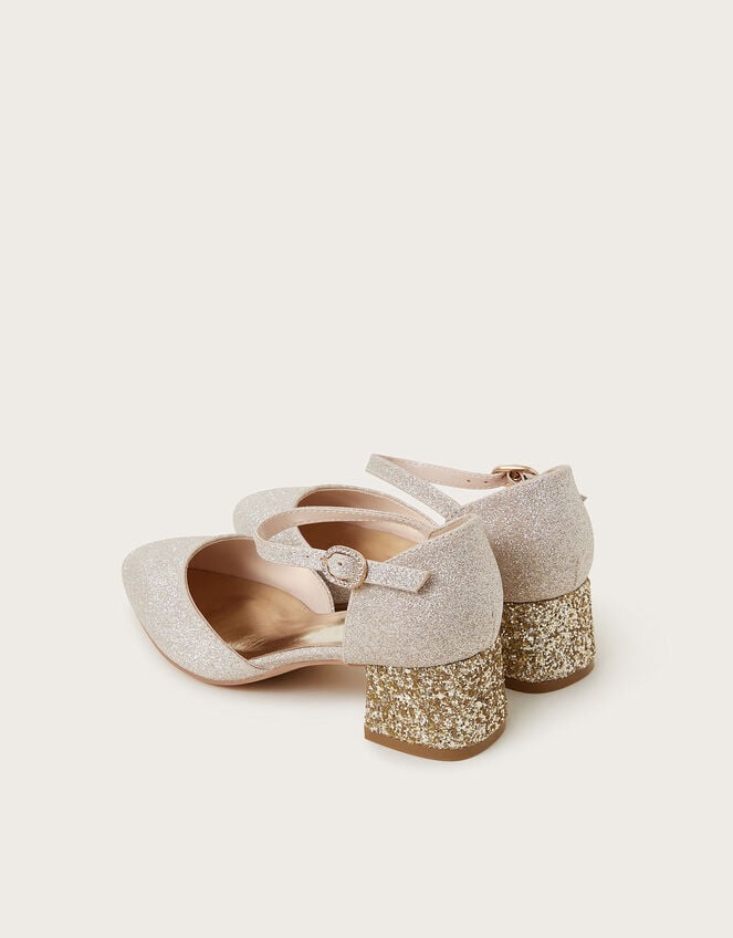 Where's the dancefloor? Covered in sparkly gold glitter with even sparklier heels, these shoes are the perfect pedestal for all their party dresses. Finished with a pointed toe and a diamante buckle fastening at the ankle. Gold